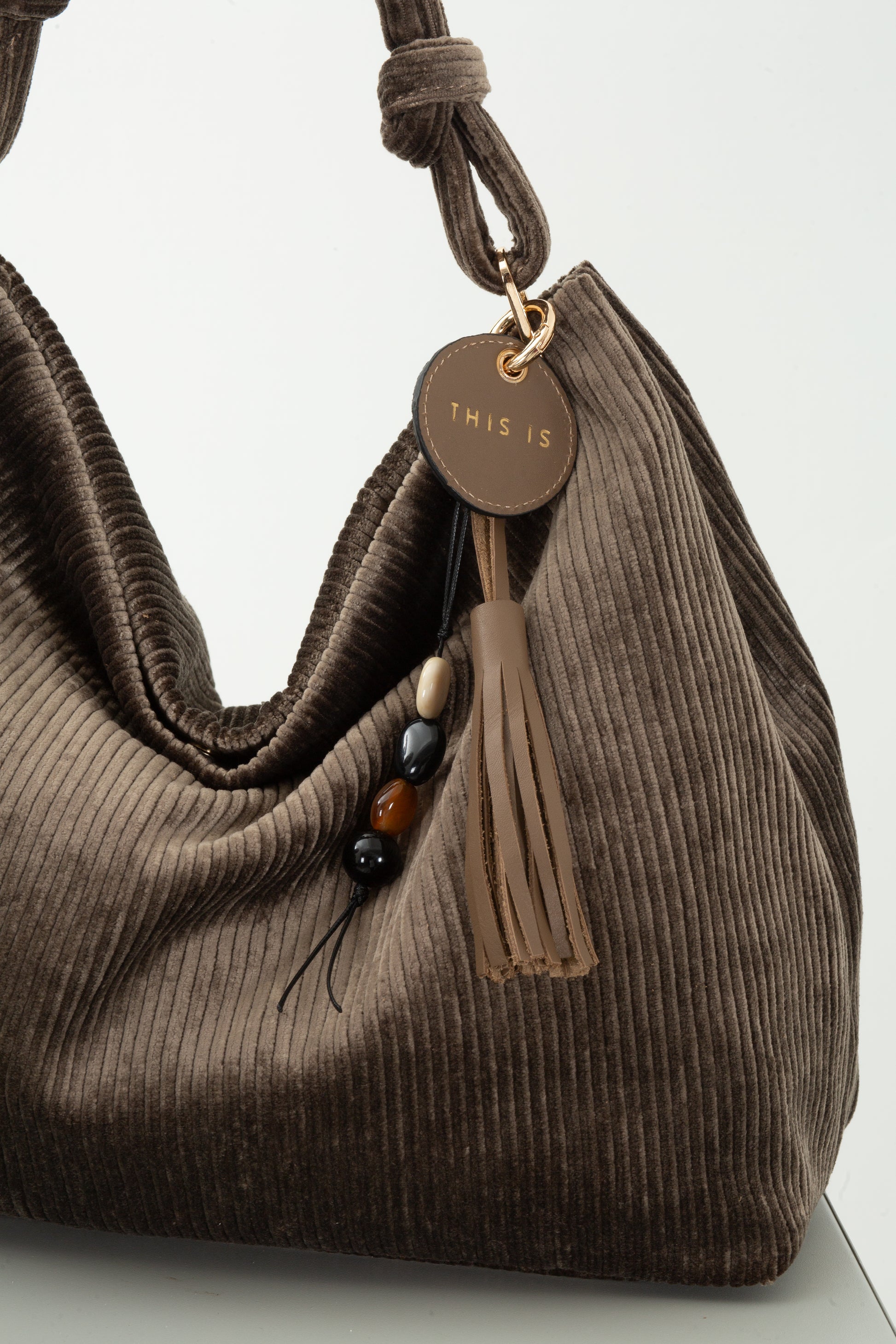 - Çanta kenarında, tek bir halka üzerinde yer alan; takılıp çıkarılabilir deri püskül